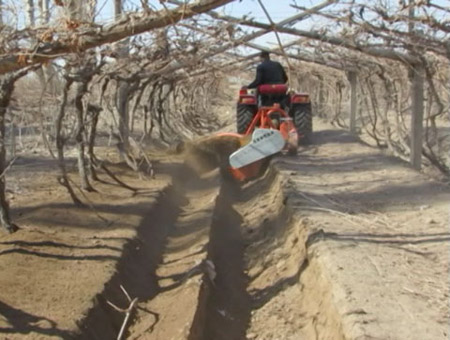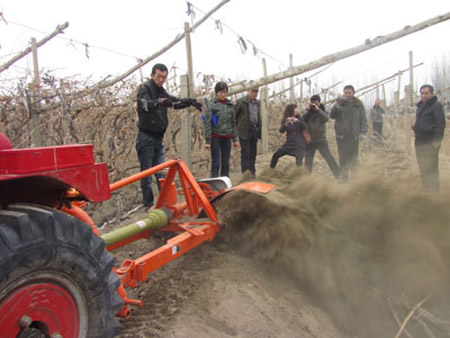 開溝埋藤機勞動強度大、作業(yè)時間緊、質(zhì)量要求高。開溝埋藤這項繁重的勞動一直是由人工完成,作業(yè)質(zhì)量差,效率低,成本高,已嚴重制約了生產(chǎn)的發(fā)展。 我單位的專利產(chǎn)品:前行走行間取土雙側開溝埋藤的研制成功,不僅大幅度提高了埋藤作業(yè)效率和作業(yè)質(zhì)量,而且大幅度降低了勞動強度和作業(yè)成本,同時解決了不同種植行距作業(yè)的問題,可適用于大于150CM以上的種植行距,不受行距和地塊大小的限制,適用范圍廣,此專利填補了國內(nèi)空白。